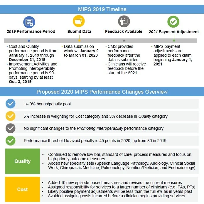 Fast facts on the upcoming reporting timeline for 2019 MIPS data and what to expect for MIPS in 2020 - including new category weights, MIPS value pathways, and more.